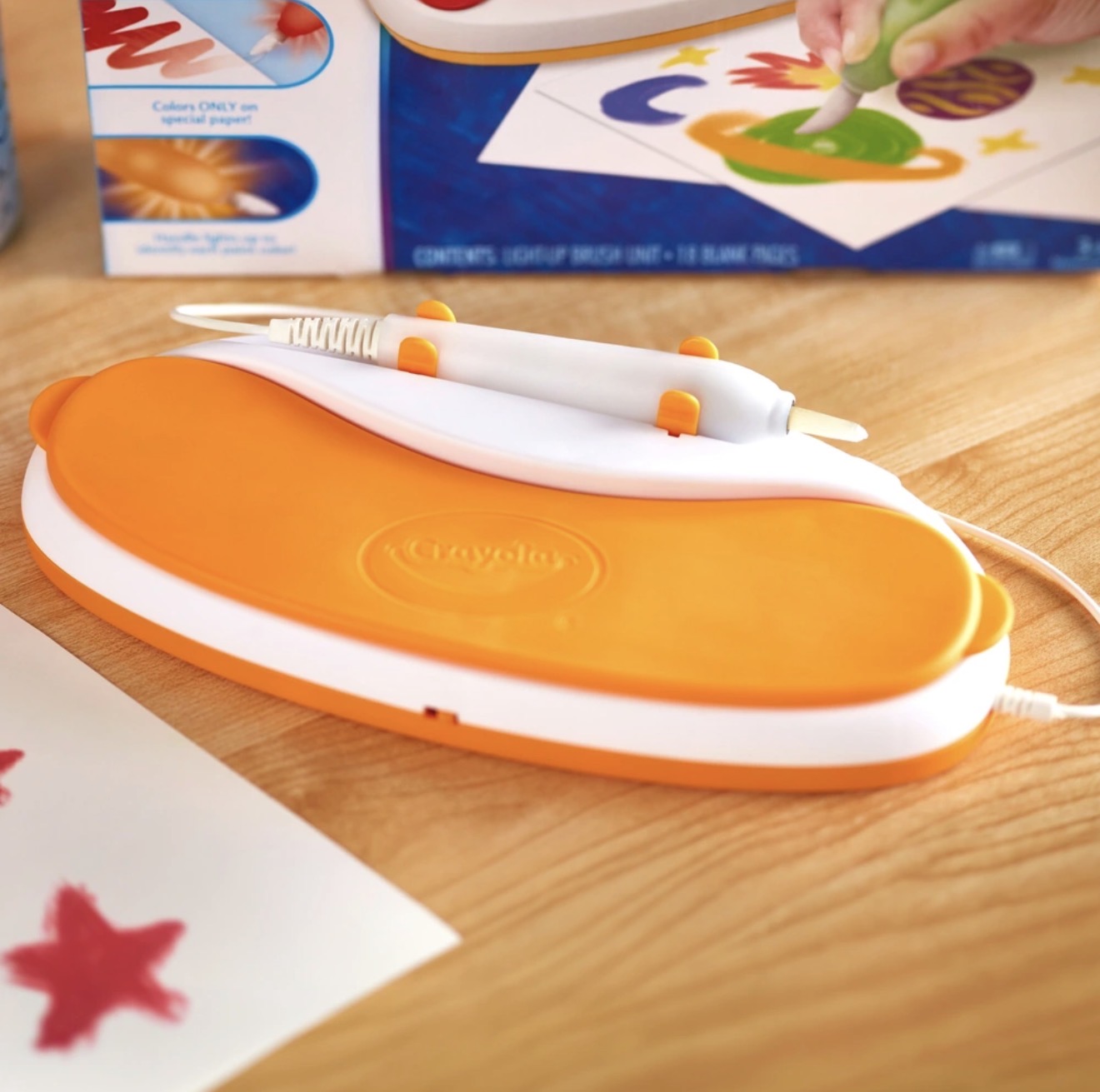 Each “paint pot” glows with vibrant color when touched by the special light-up brush, creating bright, beautiful artwork on special color sheets — with no stains, no water, and no mess.
